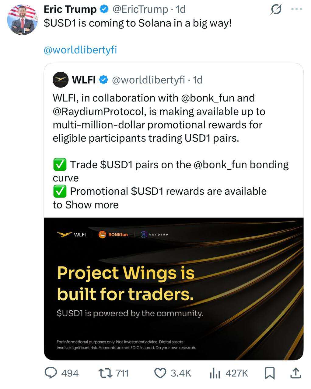 美国总统唐纳德·特朗普的儿子埃里克·特朗普(Eric Trump)宣布,World Liberty Financial($WLFI)将与 BONK (@bonk_inu) , BONK.fun 和 Raydium合作,携带 $USD1 登陆 Solana。